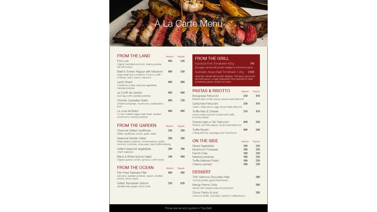 Why pick just 1 when you can get 2? Enjoy Scarlett’s 2-course set menu for just THB 480 net, which includes a choice of 1 starter and 1 main course from a selection of 23 dishes. Or upgrade to The Family Feast for just THB 1,300 net for a selection of 3 starters, 3 mains from our set menu selection and 6 pieces of French-style choux dessert.