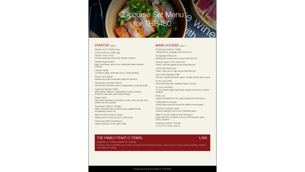 2-Course Set Menu for THB 480 & The Family Feast for THB 1,300