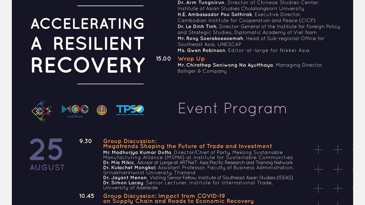 This forum aims to bring together policymakers, businesses, international organizations and academia to exchange views on ways to support economic integration, fostering an ecosystem for innovation and promoting environment conducive to trade and investment in CLMVT. This year, the forum will be virtually organized as back-to-back events of the academic forum on 24-25 August and startup pitch competition on 26 August. Approximately 200 attendees and distinguished speakers coming from CLMVT countries and their trading partners, as well as other ASEAN member states and are expected. (More information about pitch competition available in the registration form below)