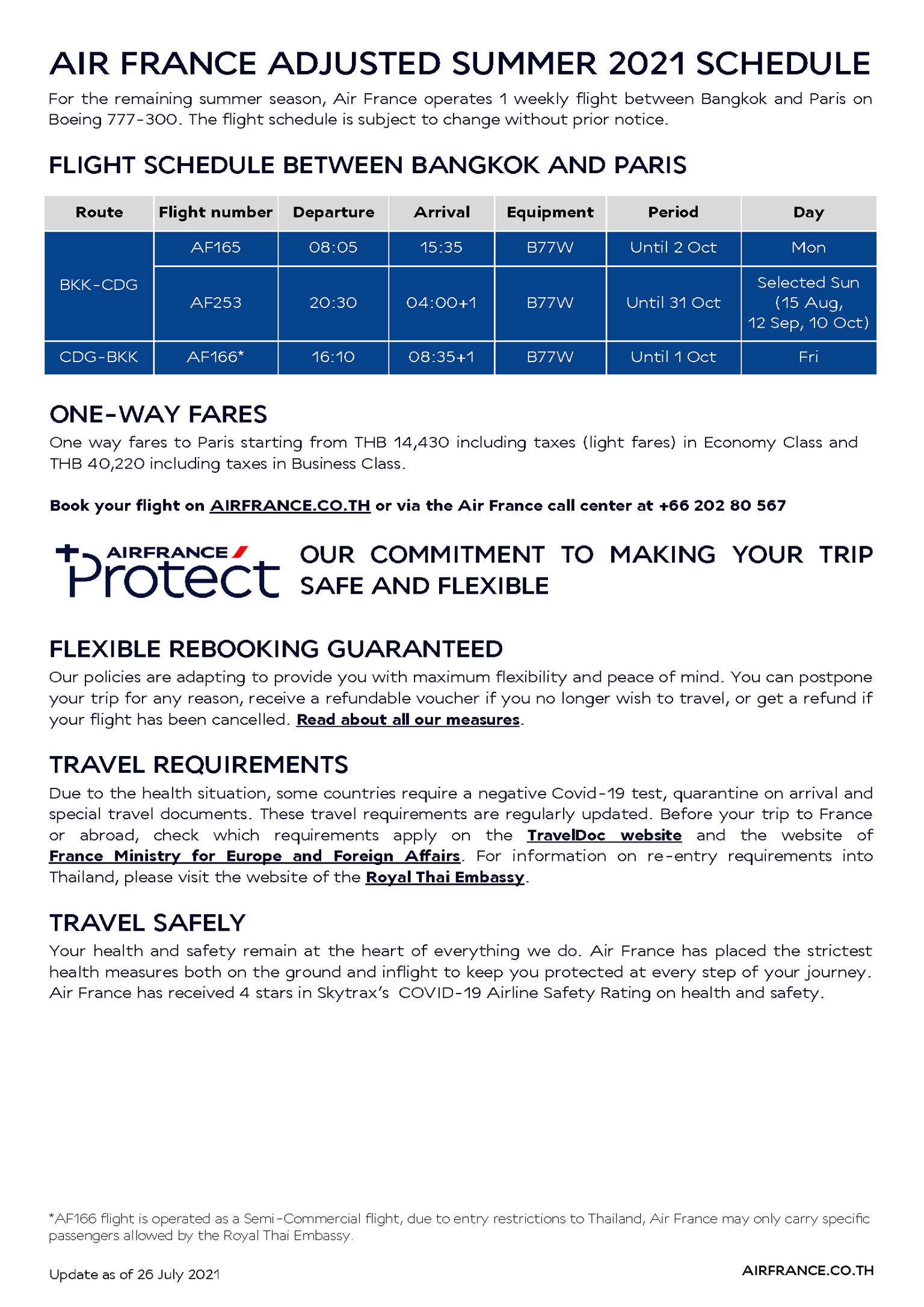 For the remaining summer season, Air France operates 1 weekly flight between Bangkok and Paris on Boeing 777-300. The flight schedule is subject to change without prior notice.