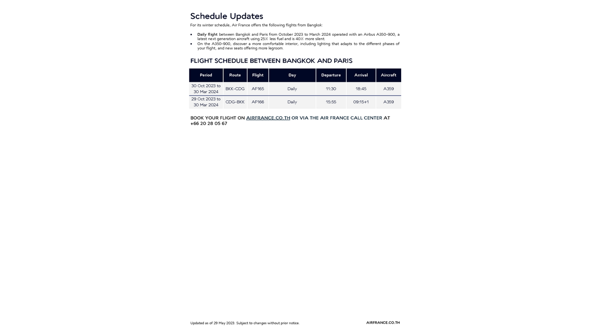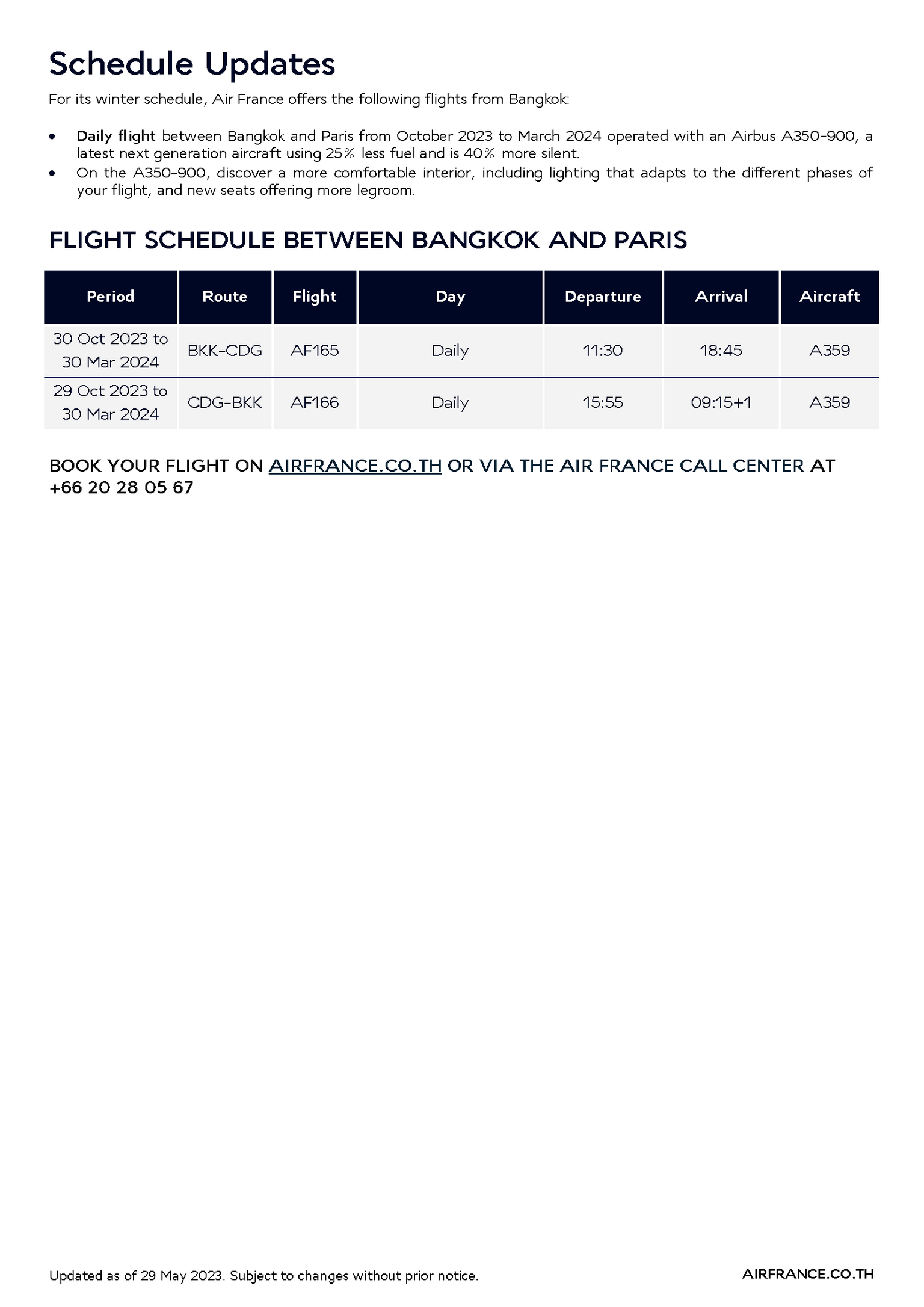 Schedule Updates For its winter schedule, Air France offers the following flights from Bangkok: