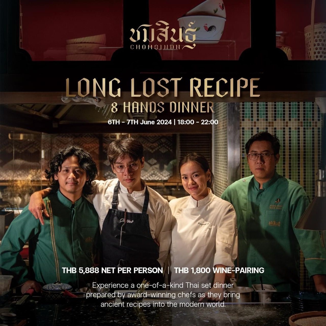 Join Head Chef Praween and 3 award-winning chefs for an exclusive 8 hands dinner, reviving ancient Thai recipes with a modern twist.