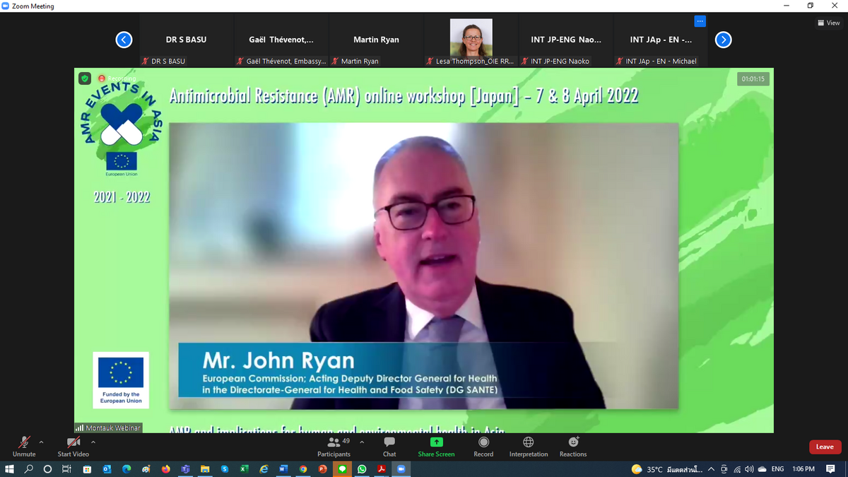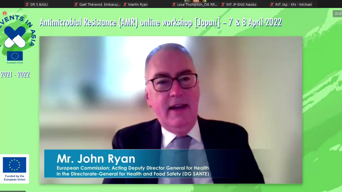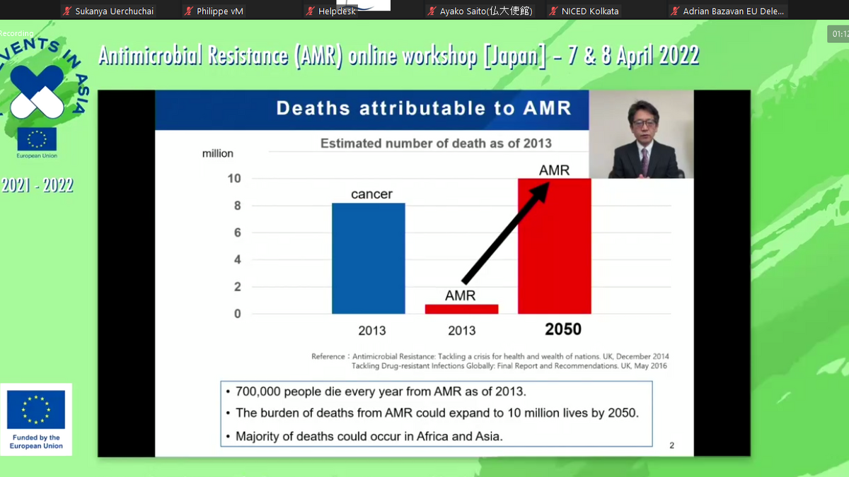 During his keynote address at the EU-Asia Online Workshop on “Antimicrobial Resistance (#AMR) and implications for human and environmental health in Asia”, Dr. Yasuyuki Sahara, Director General of the Health Service Bureau at the Ministry of Health, Labour and Welfare of Japan, said that “Japan has implemented its national AMR Action Plan since 2016 and played a key role in cooperation with other countries, especially in Asia through ASPIRE: Asia-Pacific One Health Initiative on AMR”.