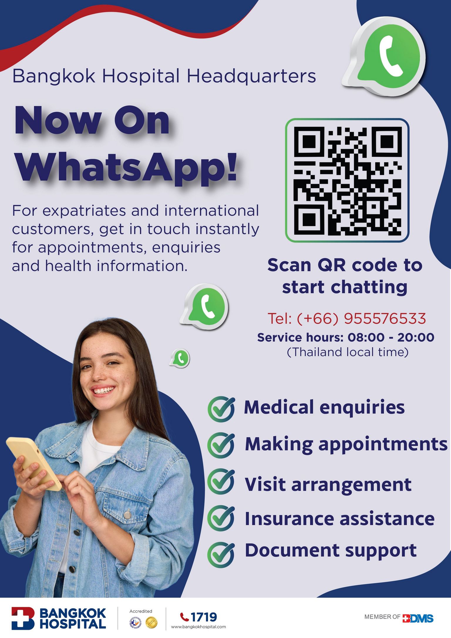 Our official WhatsApp Business account is now available for expatriates and international customers of Bangkok Hospital Headquarters. Connect with us instantly for health information and medical assistance.