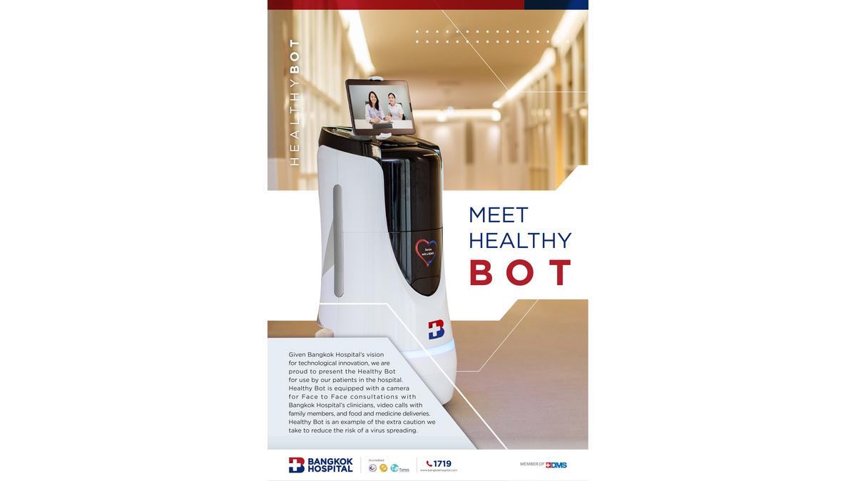 Given Bangkok Hospital’s vision for technological innovation, we are proud to present the Healthy Bot for use by our patients in the hospital. Healthy Bot is equipped with a camera for Face to Face consultations with Bangkok Hospital’s clinicians, video calls with family members, and food and medicine deliveries. Healthy Bot is an example of the extra caution we take to reduce the risk of a virus spreading.