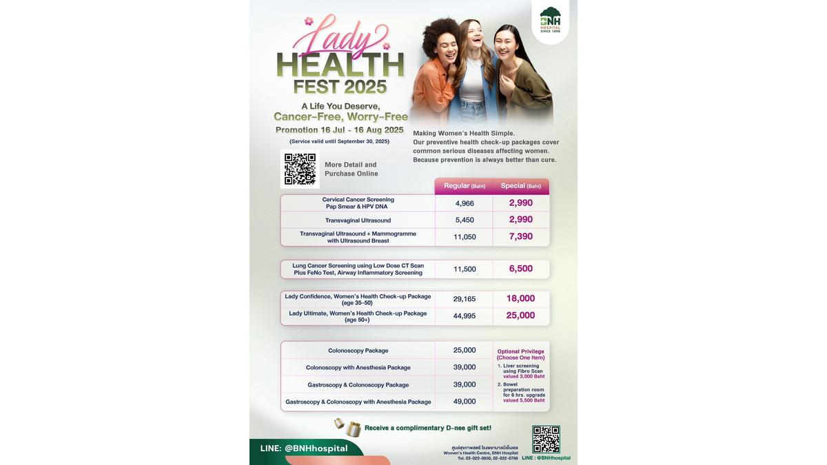 Promotion period: July 16 – August 16, 2025 (Services must be used by September 30, 2025) For more details, click here: https://www.bnhhospital.com/women-health-complete-care