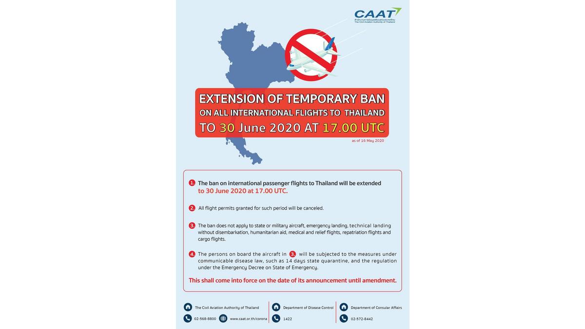 Breaking News: Extension of its temporary ban on all international passenger flights to Thailand from 1 June to 30 June 2020