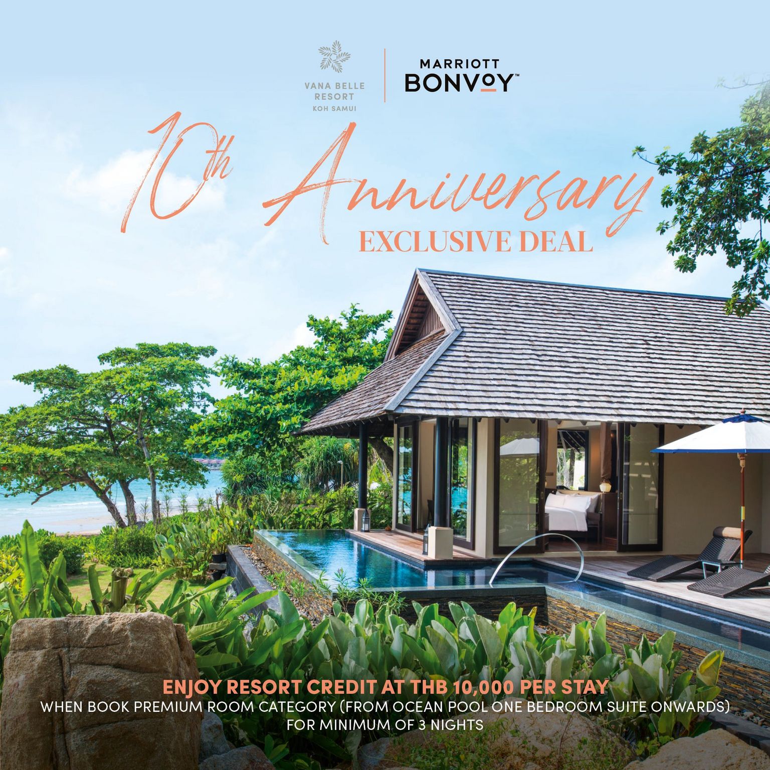 Celebrating our 10th year anniversary of pride and renowned reputation, we are delighted to offer an exclusive deal, get a THB 10,000 resort credit per stay when book Premium room category minimum of 3 nights.