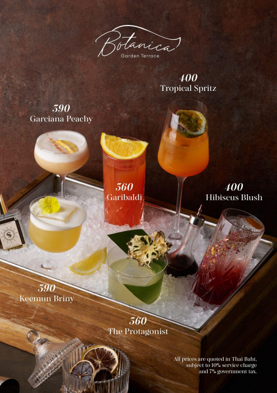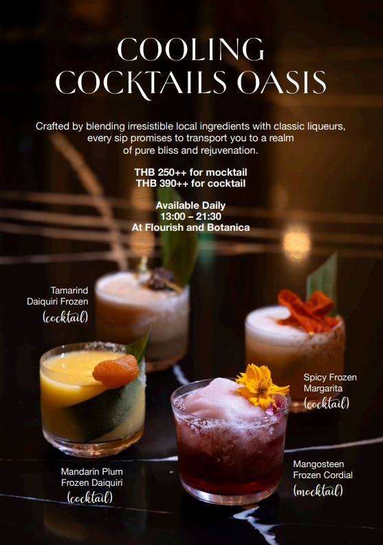 Crafted by blending irresistible local ingredients with classic liqueurs, every sip promises to transport you to a realm of pure bliss and rejuvenation. Sip, savour and stay refreshed with Tamarind Daiquiri Frozen, Spicy Frozen Margarita, Mandarin Plum Frozen Daiquiri, Garciana Peachy, Hibiscus Blush, The Protagonist and more. Mocktails start from THB 250++ and Cocktails start from THB 390++