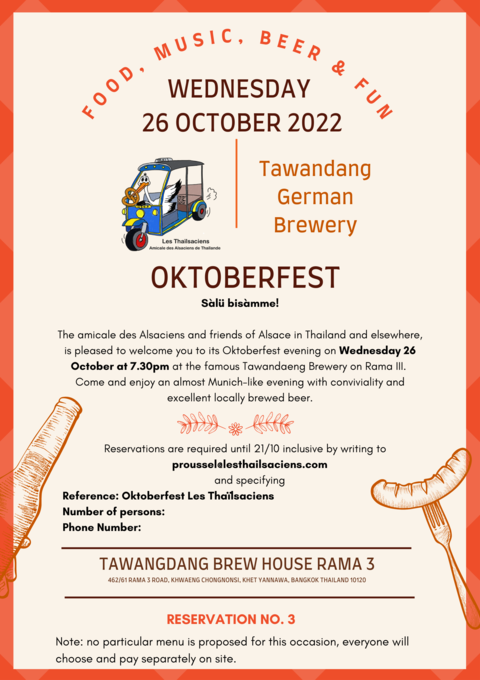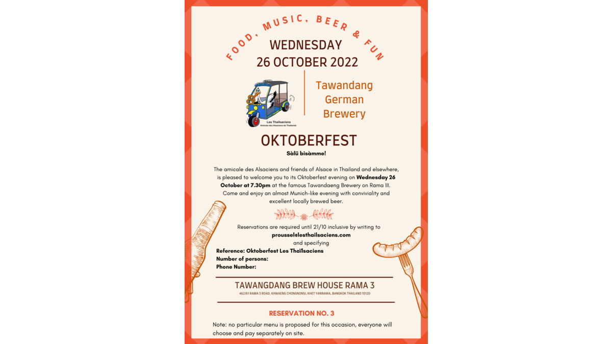 The amicale des Alsaciens and friends of Alsace in Thailand and elsewhere, is pleased to welcome you to its Oktoberfest evening on Wednesday 26 October at 7.30 PM at the famous Tawandaeng Brewery on Rama III.