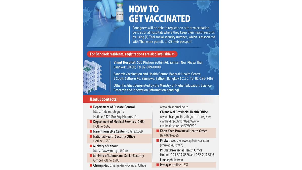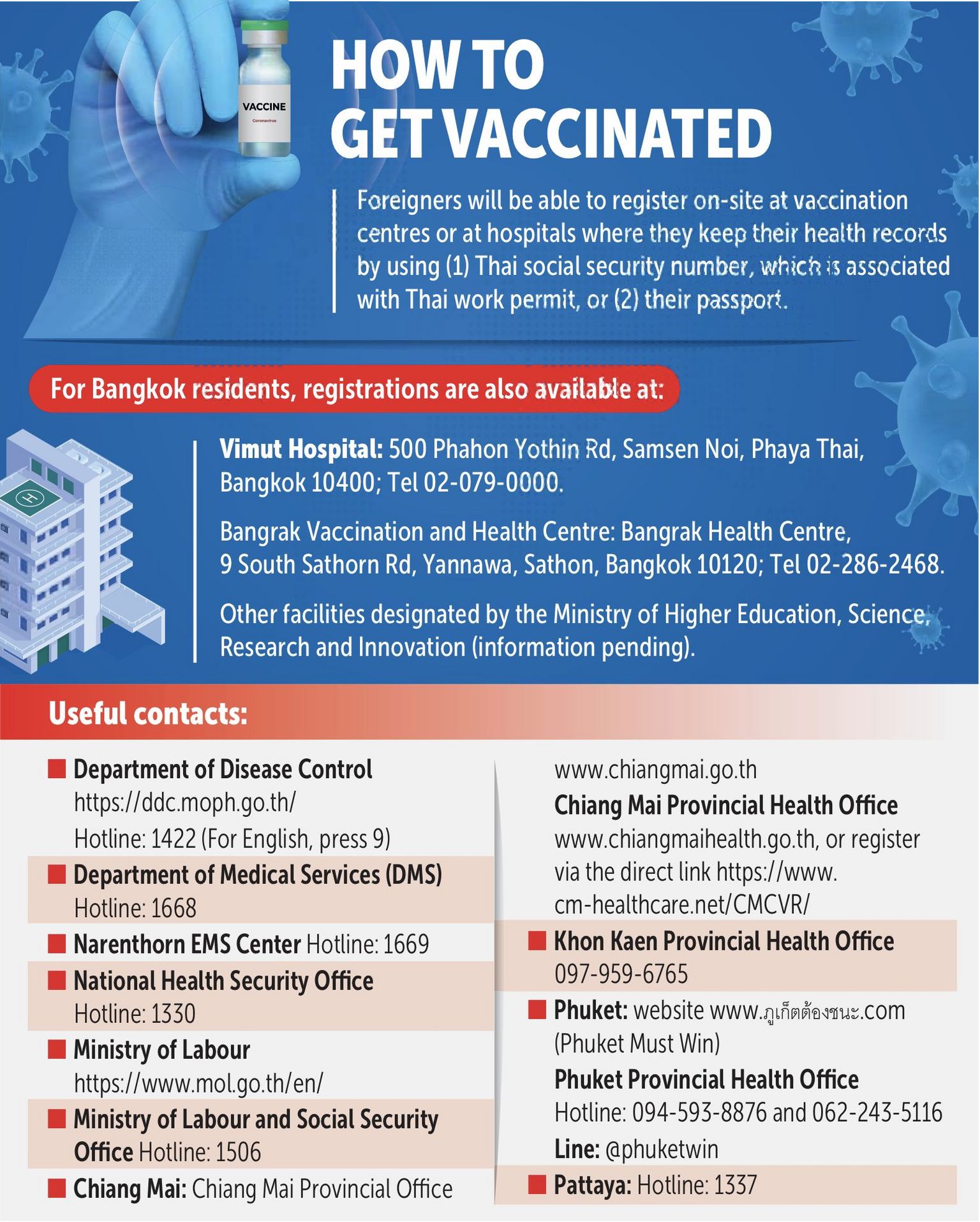 Foreigners in Bangkok can contact VIMUT Hospital or Bangrak Vaccination & Health Center, using their social security number or their passport