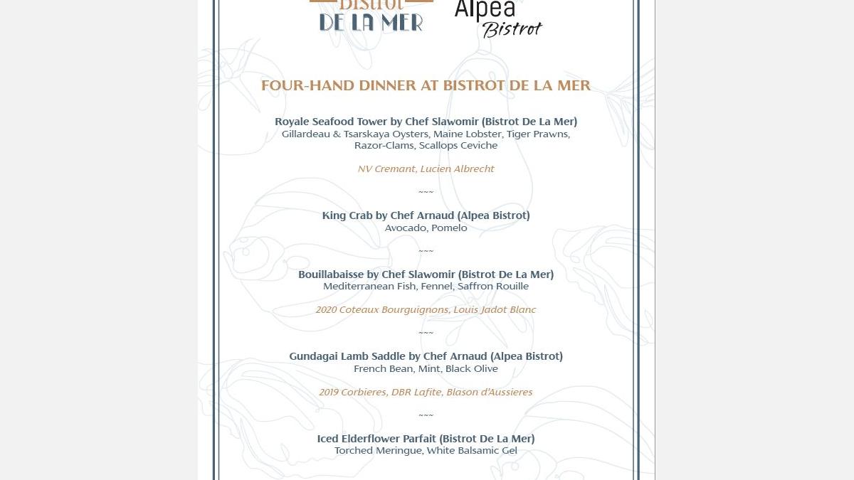 Enjoy Four – Hand Dinner at Bistrot De La Mer, on floor 19, on Friday 15 September 2023 from 19:00 onwards.