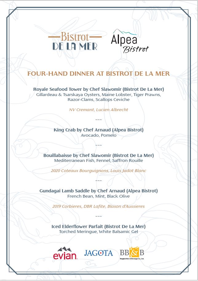 Bangkok, 11 September 2023 – Join us for an exclusive evening of gourmet indulgence at our upcoming Four-Hand Dinner. Chef Arnaud Dunand Sauthier, owner and chef de cuisine at Alpea Bistrot, and Chef Slawomir Kowalik, chef de cuisine at Bistrot De La Mer, join creative forces in a one-off dining event highlighting fine French gastronomy.