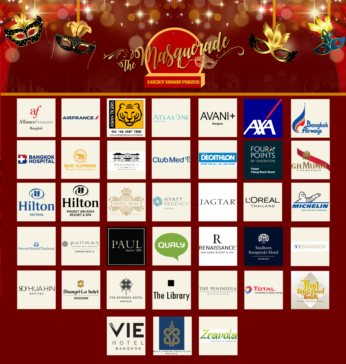 Alliance Française de Bangkok , AirFrance, Asian Tigers Thailand, Atlas One Group, Avani+ Riverside Bangkok Hotel, AXA Thailand, Bangkok Hospital Thailand, Blue Elephant Cooking School & Restaurant Bangkok, Brasserie 9 , Club Med, Decathlon Thailand ดีแคทลอน ประเทศไทย, Four Points by Sheraton, Champagne MUMM, Hilton Pattaya, Hilton Phuket, Hotel Muse, Bangkok , L'Oréal Group , Michelin, Pullman Bangkok Hotel G, PAUL Thailand, Qualy, Renaissance Koh Samui Resort & Spa Sindhorn Kempinski Hotel Bangkok, SO/ Bangkok, SO Sofitel Hua Hin, Shangri-La Hotel, Bangkok , The Athenee Hotel, a Luxury Collection Hotel, Bangkok, TheLibrary KohSamui The Peninsula Bangkok, Total , Thai Bus Food Tour, VIE Hotel Bangkok, MGallery, Royal Varuna Yacht Club, Zeavola Resort