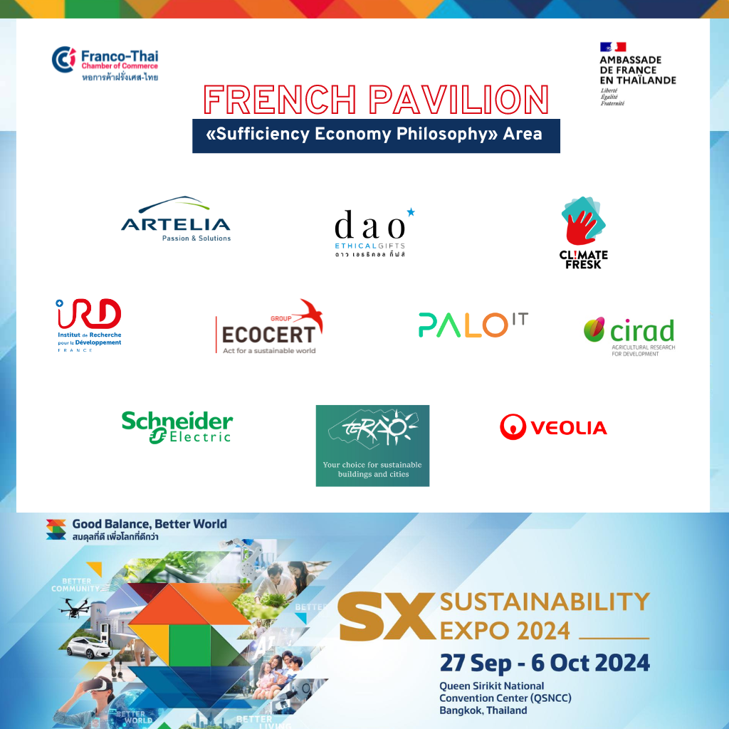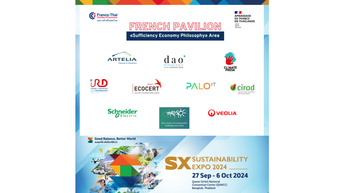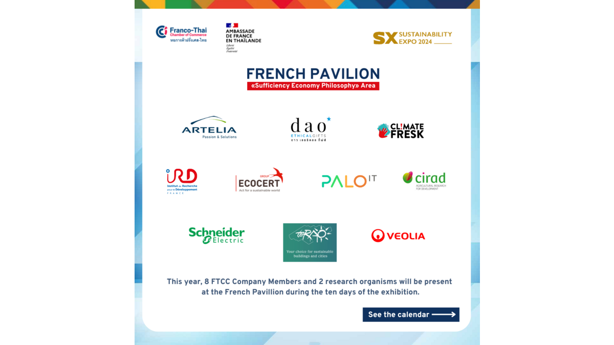 The Franco-Thai Chamber of Commerce and the French Embassy invite you to come and discover the pioneering French ESG companies at the France Pavilion of the 2024 Sustainability Exhibition, in the «Sufficiency Economy Philosophy» area!