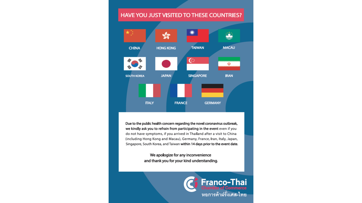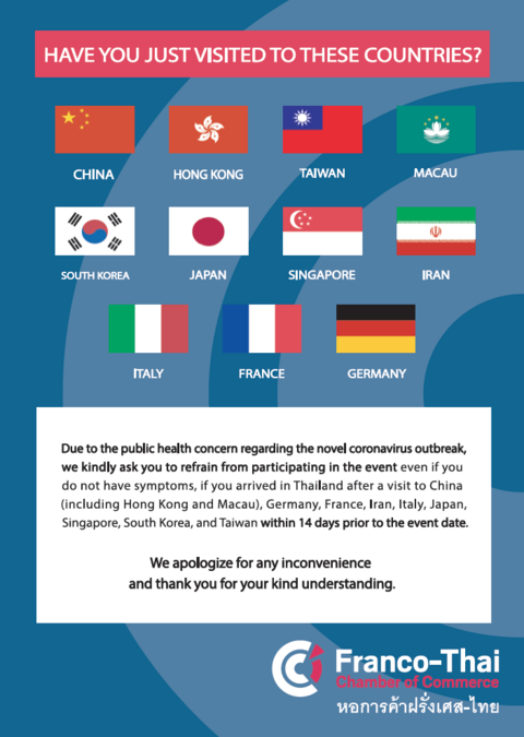 Due to the public health concern regarding the novel coronavirus outbreak, we kindly ask you to refrain from participating in the event even if you do not have symptoms if you arrived in Thailand after a visit to China (including Hong Kong and Macau), Germany, France, Iran, Italy, Japan, Singapore, South Korea, and Taiwanwithin 14 days prior to the event date.