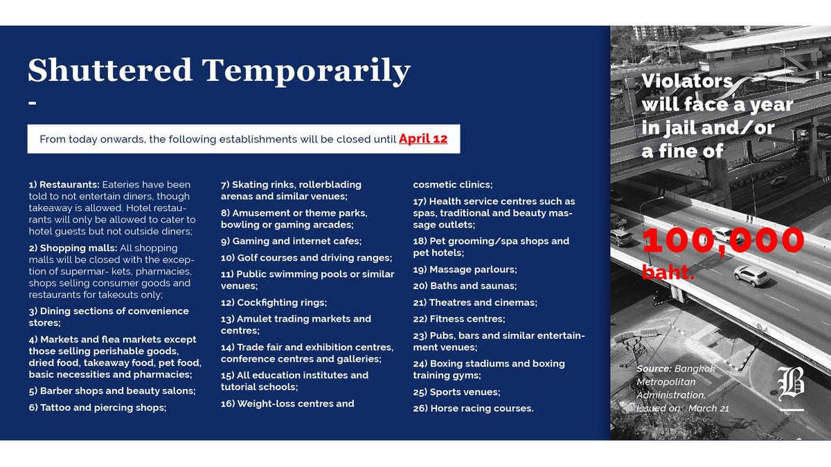 In line with the measure to control the virus outbreak in Bangkok, please find the summary of the policies issued to close down the following establishments temporarily, thanks to Bangkok Post.