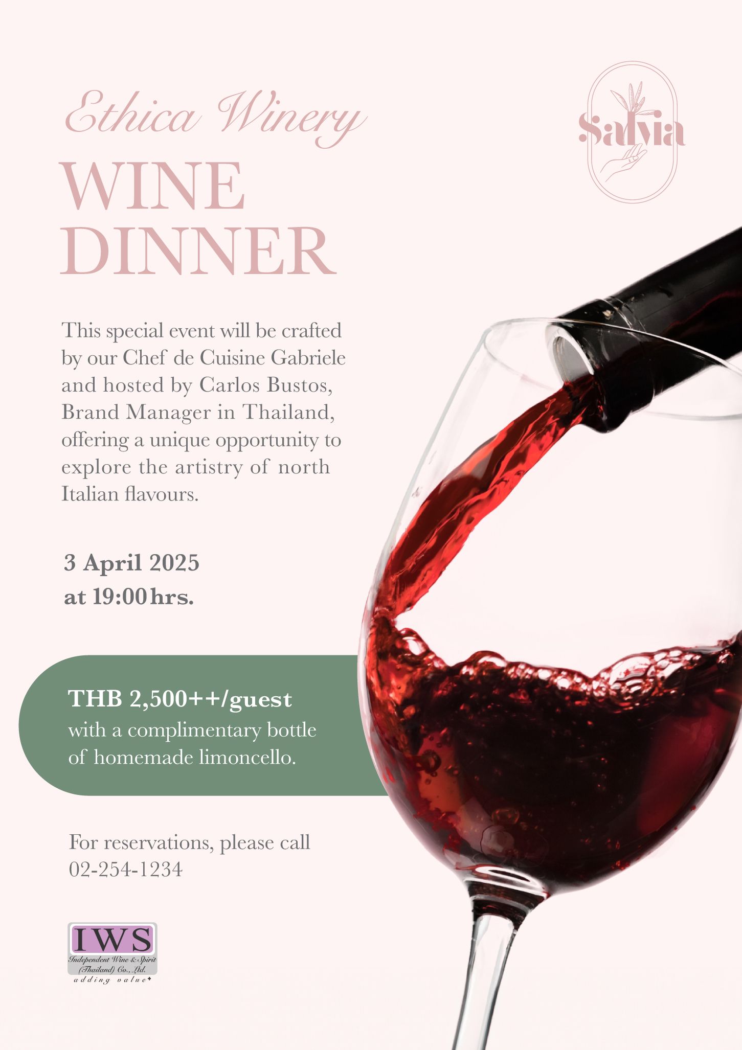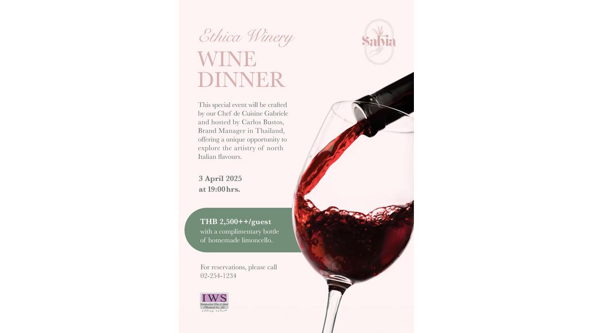 This event will take place at Salvia Italian Osteria, in the private room Cellar, on Thursday, 3 April 2025, at 19:00 hrs. The price is THB 2,500++ per person.