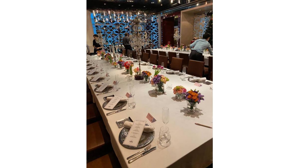 Contadi Castaldi Franciacorta Brut (sparkling) paired with canapés; Cembra Müller Thurgau Trentino W'21 (white) with yellowfin tuna rolls; Borgogno No Name 2019 (red) with braised pork cheek agnolotti, Castelmagno cheese fondue and black truffle; Borgogno Barolo 2018 (red) with roasted Coastal lamb saddle, spinach stuffing and celeriac purée.