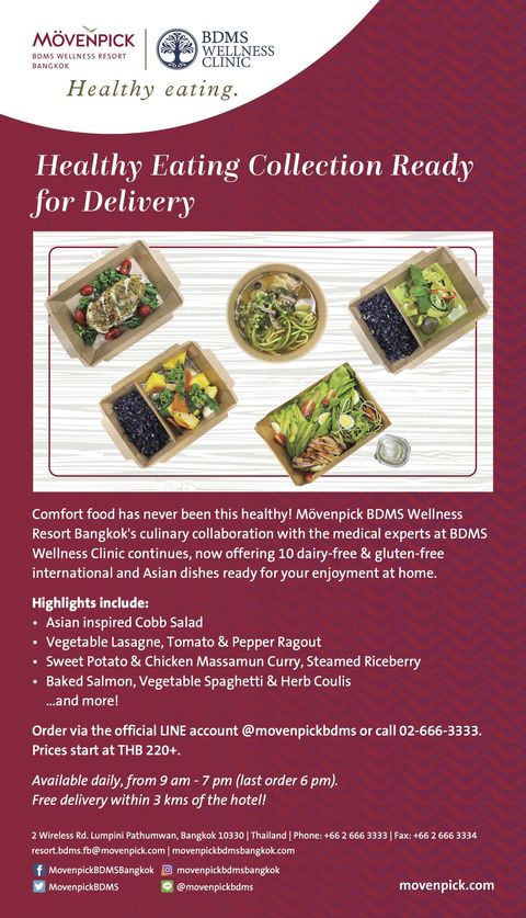 Mövenpick BDMS Wellness Resort Bangkok has expanded its culinary collaboration with the medical experts at BDMS Wellness Clinic, offering dairy-free & gluten-free dishes to relish in the comfort of home. Free delivery within 3 kms of the hotel!