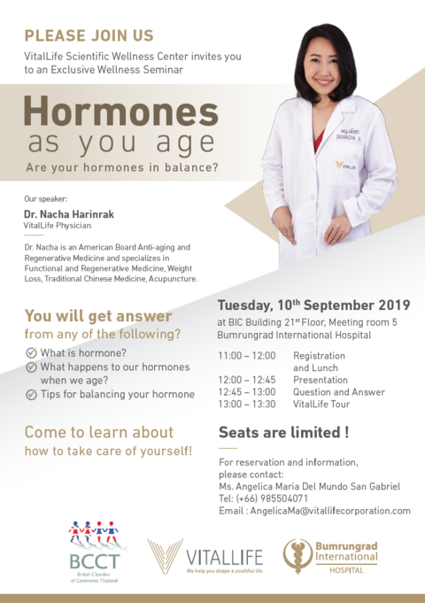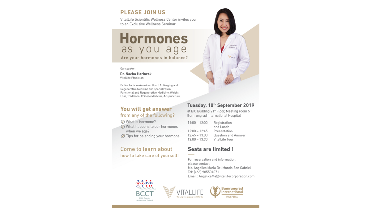 The speaker Dr. Nacha Harinrak, a VitaLife Physician, is specialized in Functional and Regenerative Medicine and will provide you tips for balancing your hormone.