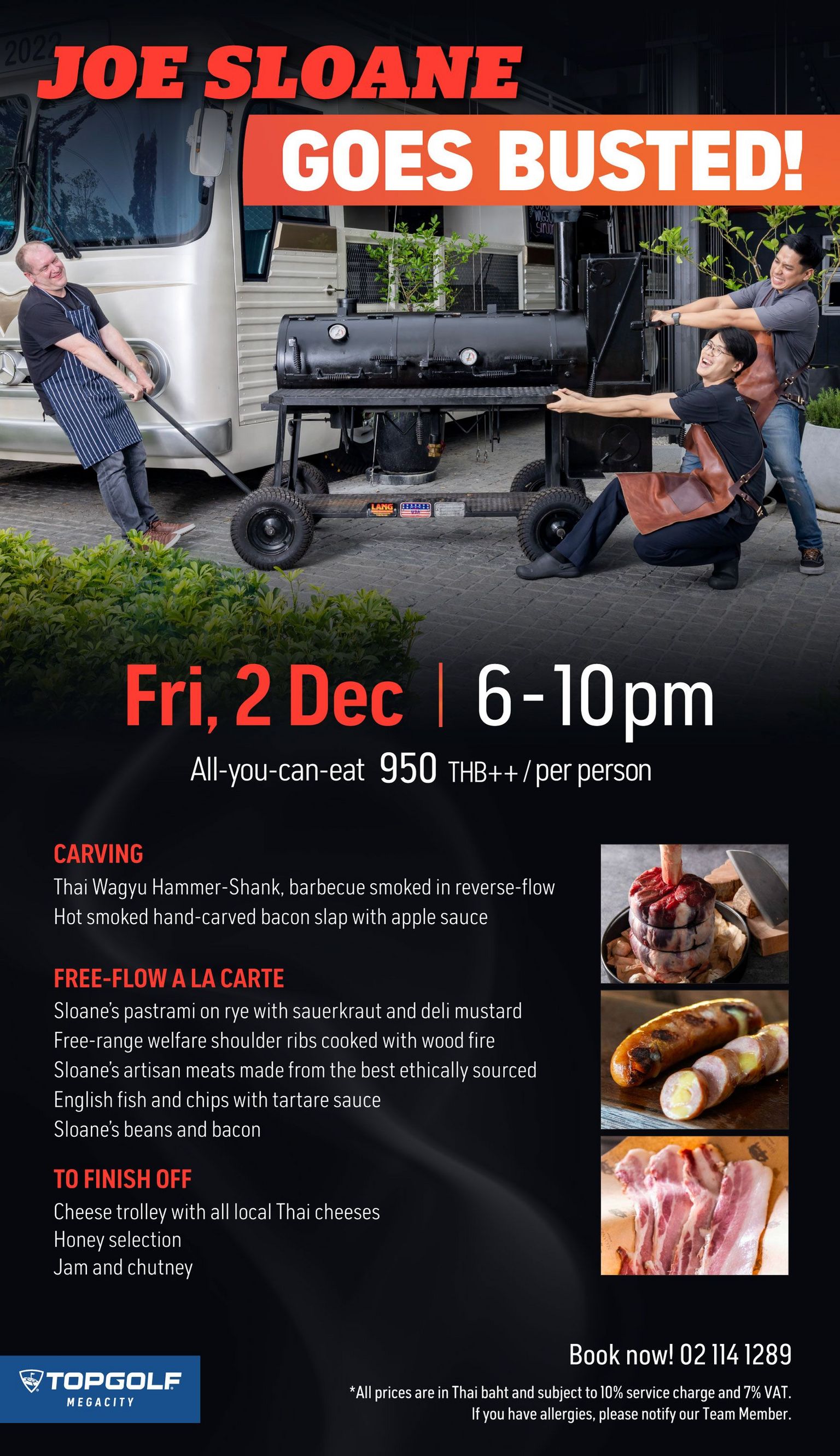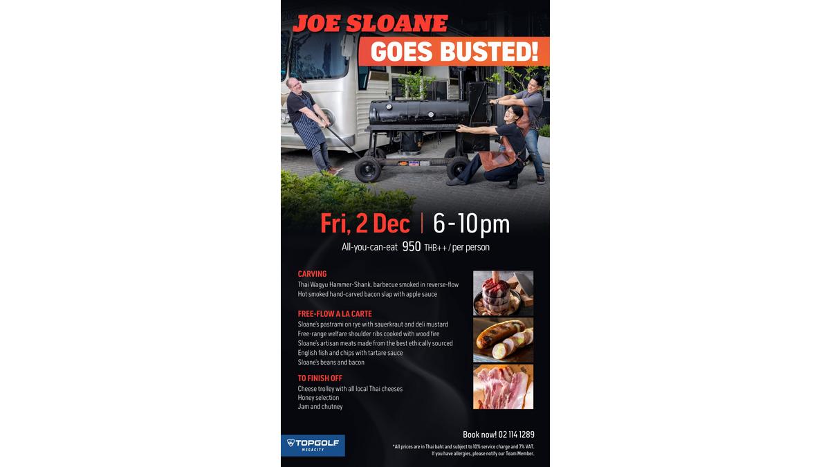 We are very delighted to share a really fun upcoming event with you. Joe Sloane - Bangkok's most famous Artisan butcher https://sloanes.co.th/ - is taking over BUSTED, 12-meter-long food bus at Topgolf Megacity on Friday, 2nd December 2022 from 6 – 10 pm. Varieties of food are waiting for you, come join us!