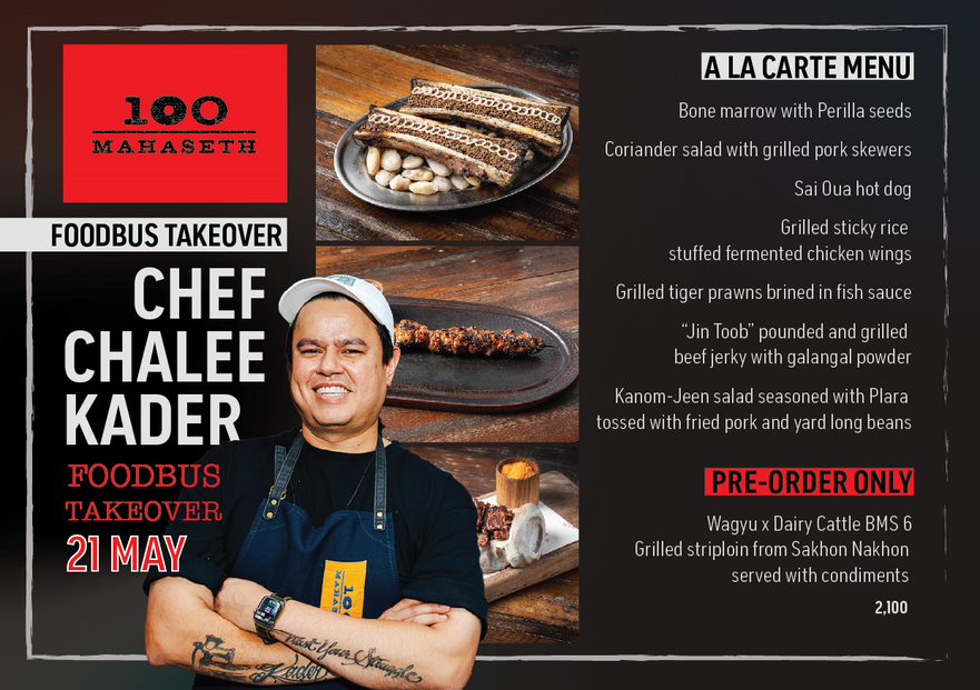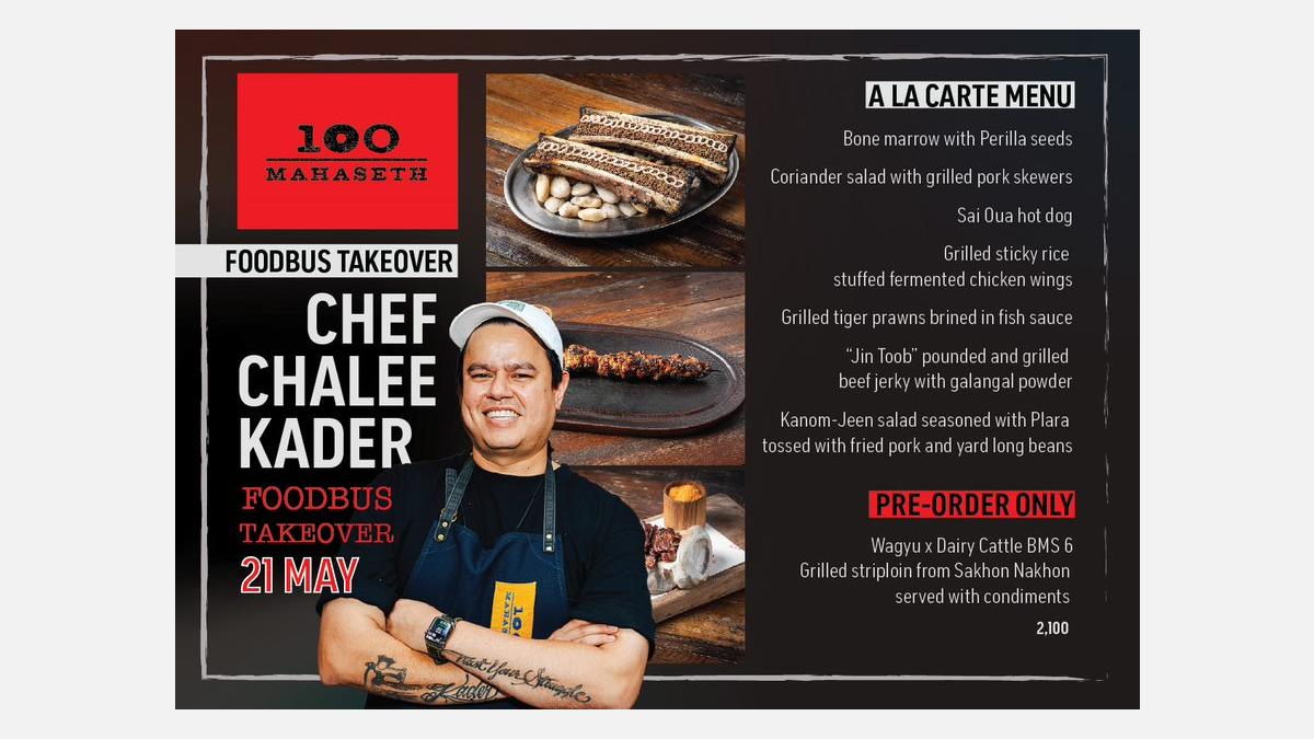 For this special occasion, Chef Chalee will be presenting his signature dishes from 100 Mahaseth in an a la carte menu format. You can savor all your favorite dishes from our menu, and order as many or as few items as you like. In addition, we are pleased to offer a special menu item exclusively for pre-order – the Wagye x Dairy Vattle BMS 6 Grilled striploin from Sakhorn Nakhon served with condiments. This dish is a true delicacy and is not to be missed. We invite you to come and enjoy our exceptional culinary experience.
