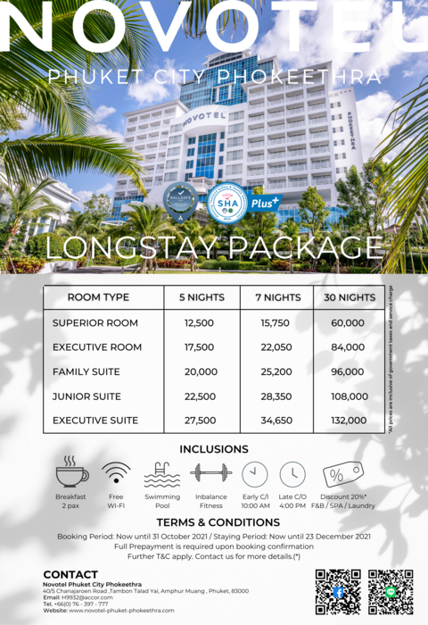 Make it all yours with a 5-night stay starting from THB 12,500, an 14-night stay starting from 15,750 or a superb 30-night stay starting at THB 60,000 at Novotel Phuket City Phokeethra.