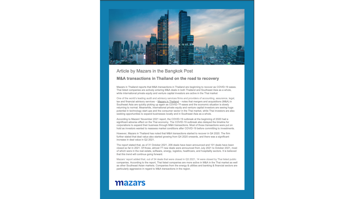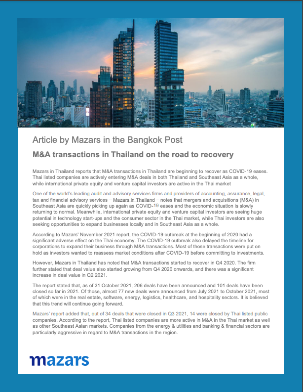Mazars in Thailand’s thought leadership article on M&A transactions in Thailand was recently featured in the media.