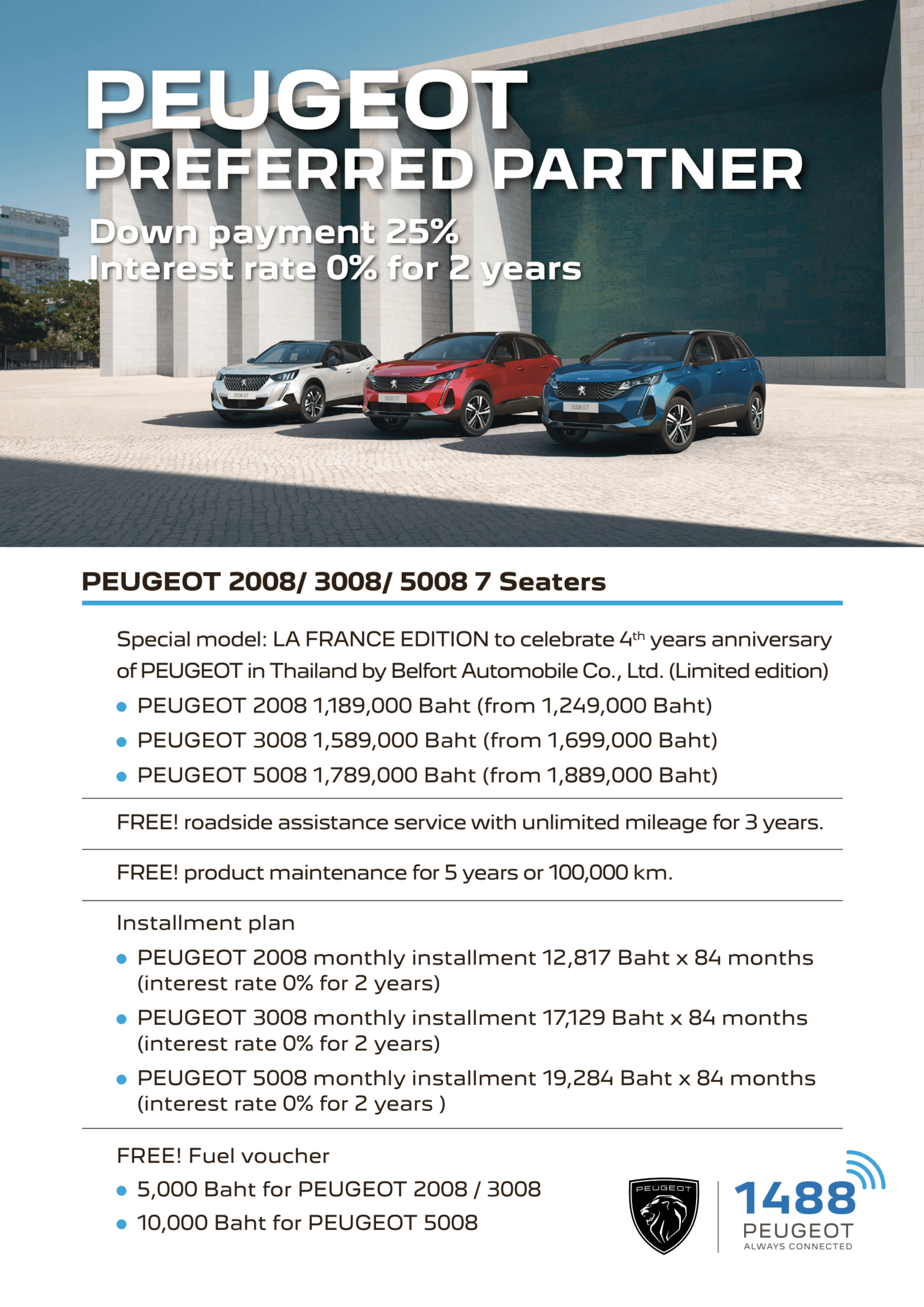 - PEUGEOT 2008 monthly installment 12,817 Baht x 84 months (interest rate 0% for 2 years)