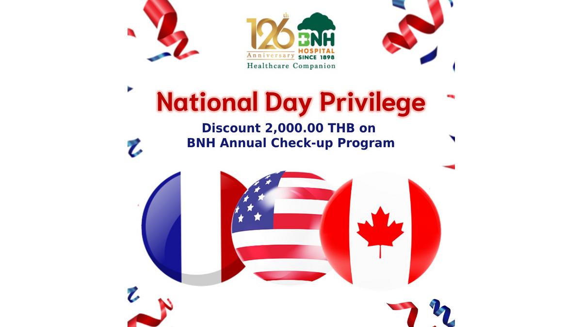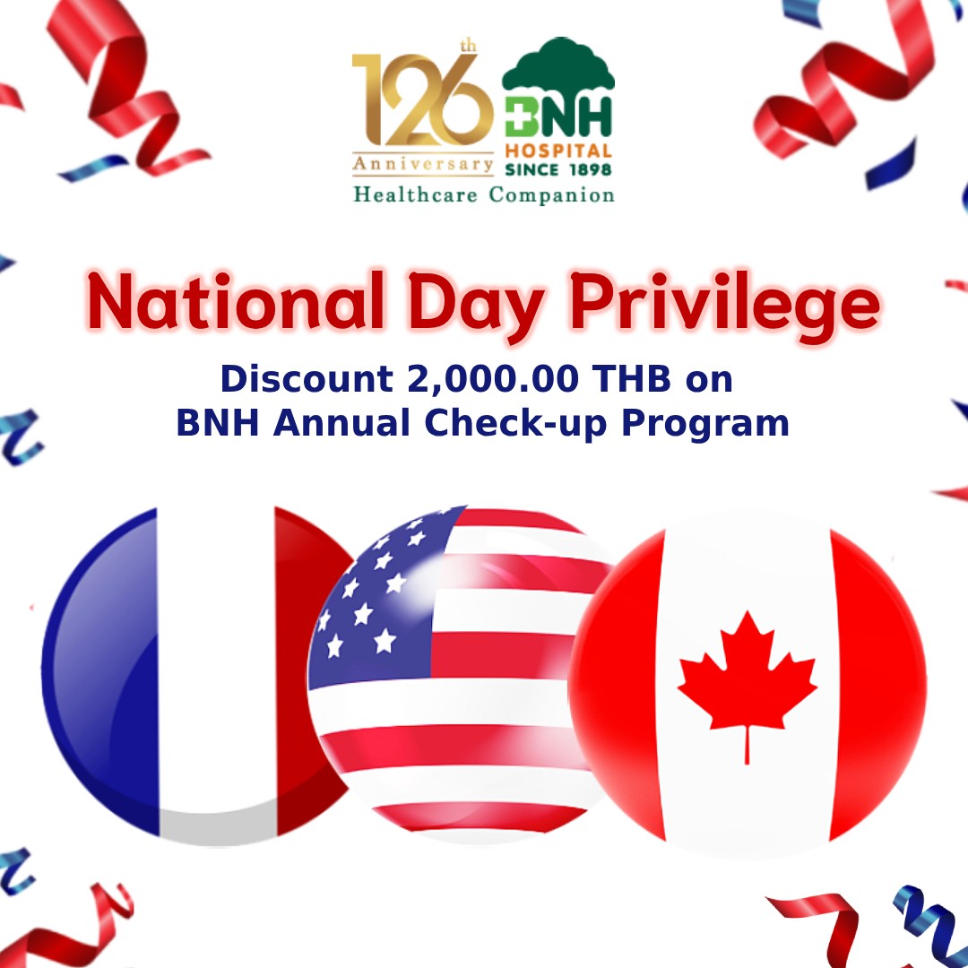 Get 2000 THB Discount on BNH Annual Health Check-up Program (excluded Young Active program) for all Canadian, American and French patients from 1-31 July 2024