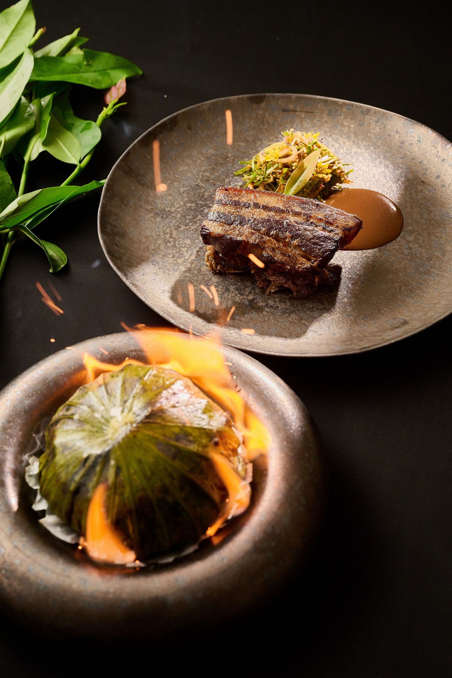 After the Lemongrass Granite with pineapple compote to cleanse the palate comes Kaeng Moo Cha Muang (Jantaburi style), Kurobuta pork loin with cowa leaf and Jantaburi curry, served with Yum Bai Cha Muang, spicy salad with cowa leaf, chilli paste dressing and coconut flake.