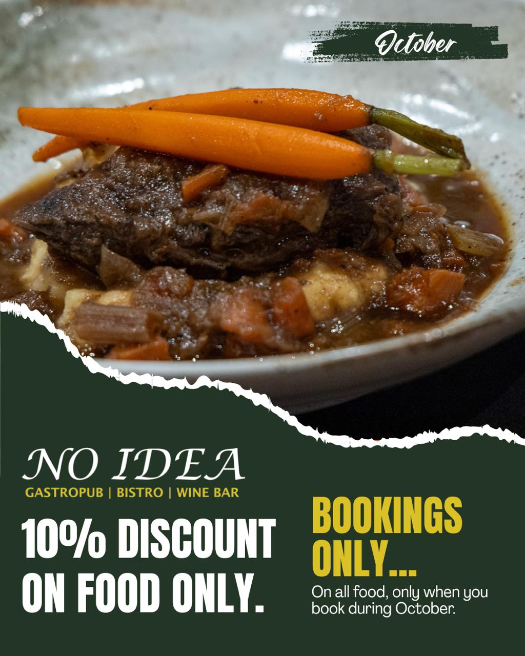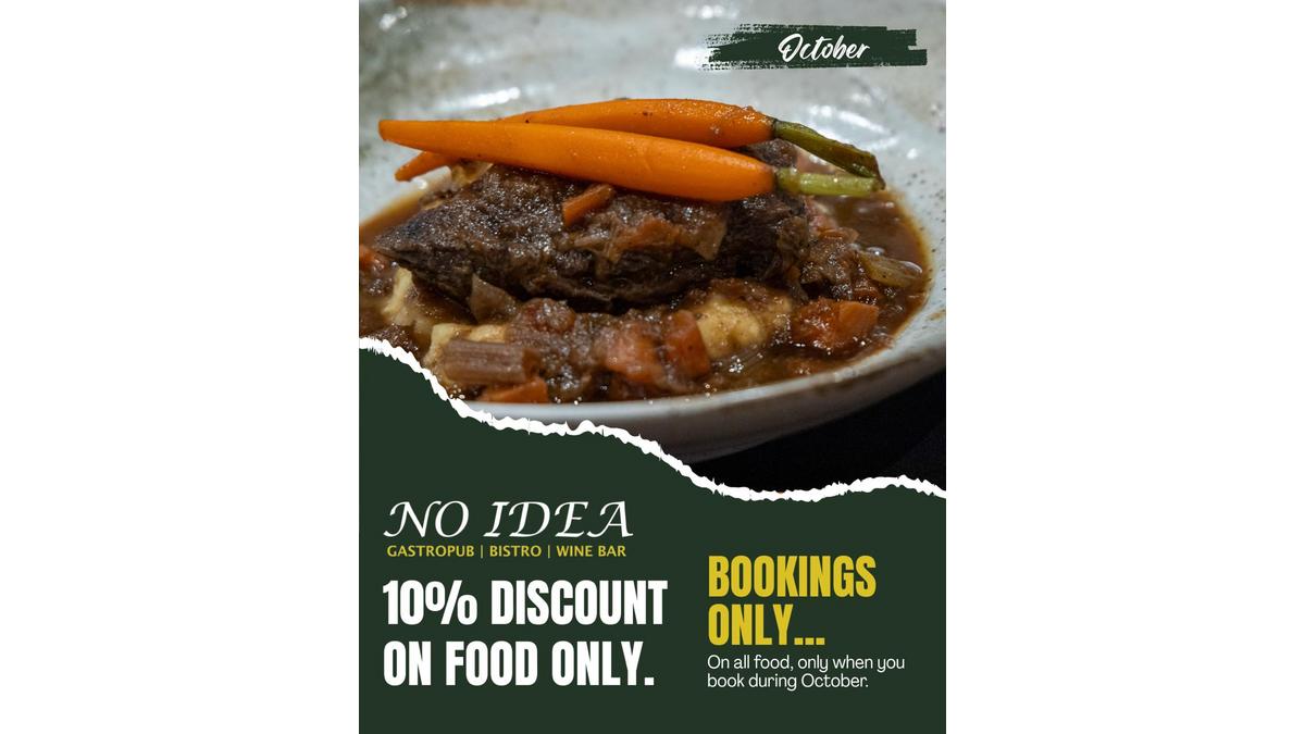 No Idea Gastropub offering 10% off all food items throughout October – but only when you book in advance.