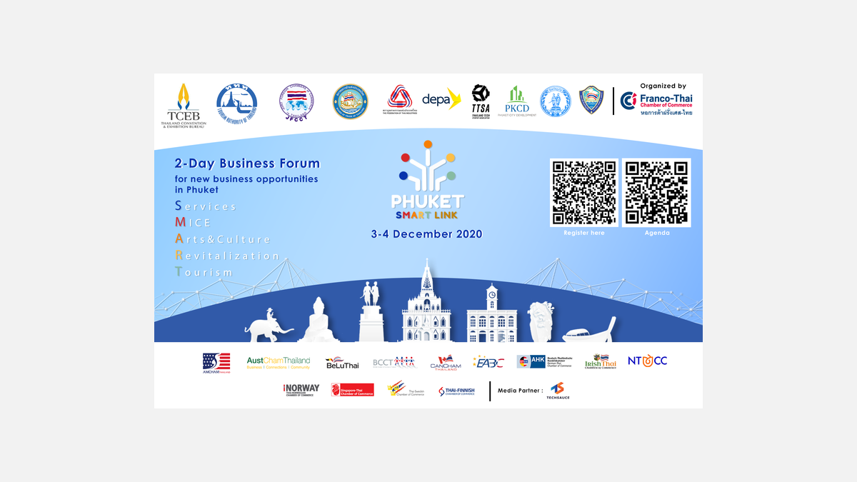Initiated by the Franco-Thai Chamber of Commerce, the Phuket SMART Link (Services, MICE, Arts&Culture, Revitalization, Tourism) was organized thanks to the support from Thailand Convention & Exhibition Bureau (TCEB), Tourism Authority of Thailand (TAT) and the Digital Economy Promotion Agency (DEPA).