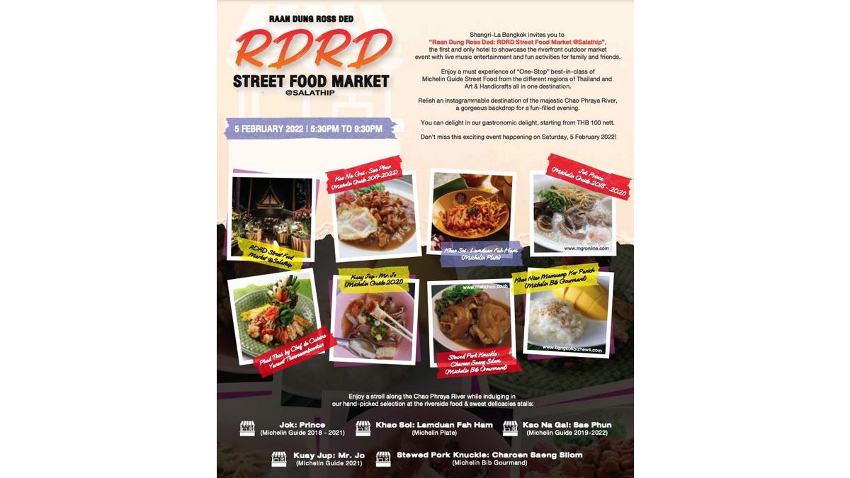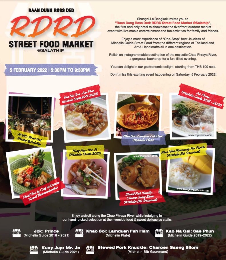 On Saturday, 5 February 2022 from 5:30pm to 9:30pm, Shangri-La Bangkok invites you to “Raan Dung Ross Ded: RDRD Street Food Market @Salathip”, the first and only hotel to showcase the riverfront outdoor market event with live music entertainment and fun activities for family and friends. Enjoy a must experience of “One-Stop” best-in-class of Michelin Guide Street Food from the different regions of Thailand and Art & Handicrafts all in one destination. Relish an instagrammable destination of the majestic Chao Phraya River. Delight in our gastronomic delight, starting from THB 100 nett.