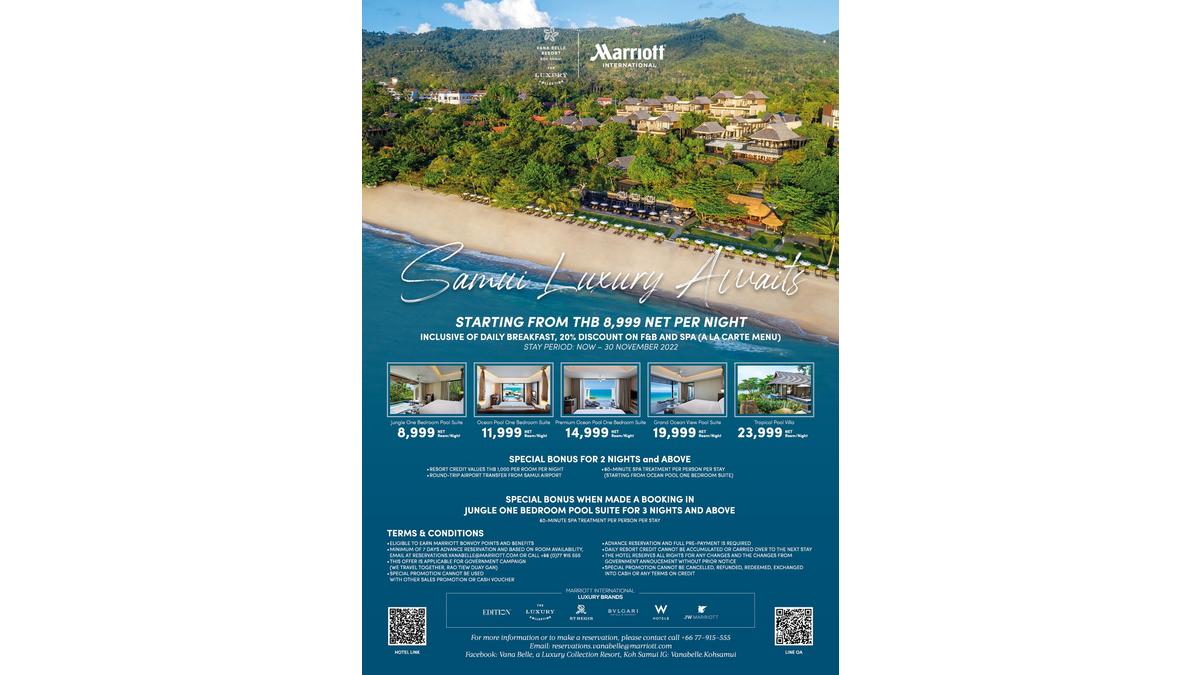 Plan your meaningful holiday with our special promotion “Samui Luxury Awaits” to embrace the spectacular experience with memorable memories in our 79 spacious pool suites and villas at Vana Belle, a Luxury Collection Resort, Koh Samui, one of Marriott International's top tiers under the Luxury Collection brand which guaranteed the highest level of personalized services by the recognition from TripAdvisor “The Travelers’ Choice Best of the Best Award” ranking no. 1 in Chaweng, Koh Samui