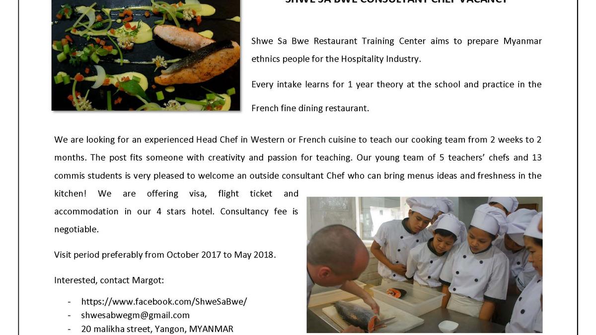 Founded by Francois Stoupan in early 2013, Shwe Sa Bwe is a hotel and restaurant training center which aims to provide training to financially disadvantaged Myanmar youth looking to pursue a career in the country’s hospitality industry. As a matter or fact, they are looking for Consultant Chefs, please see below: