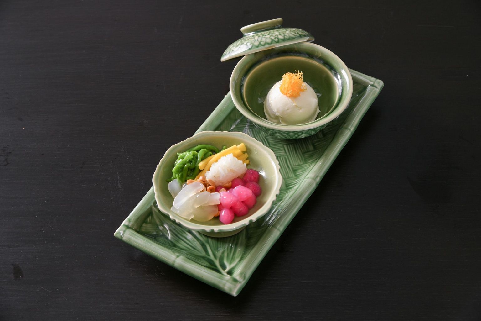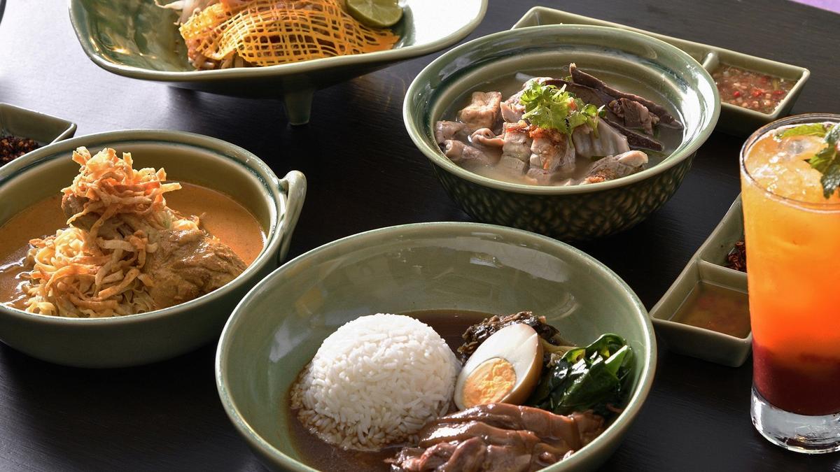 The main course featuring Michelin Bib Gourmand dishes - Guay Jub Mr. Jo, Khao Kha Moo Charoensaeng Silom and Khao Soi Lamduan Faham. Price is at THB 650++ per set.