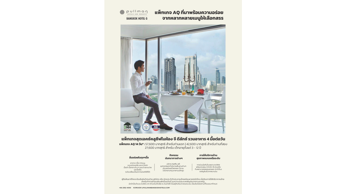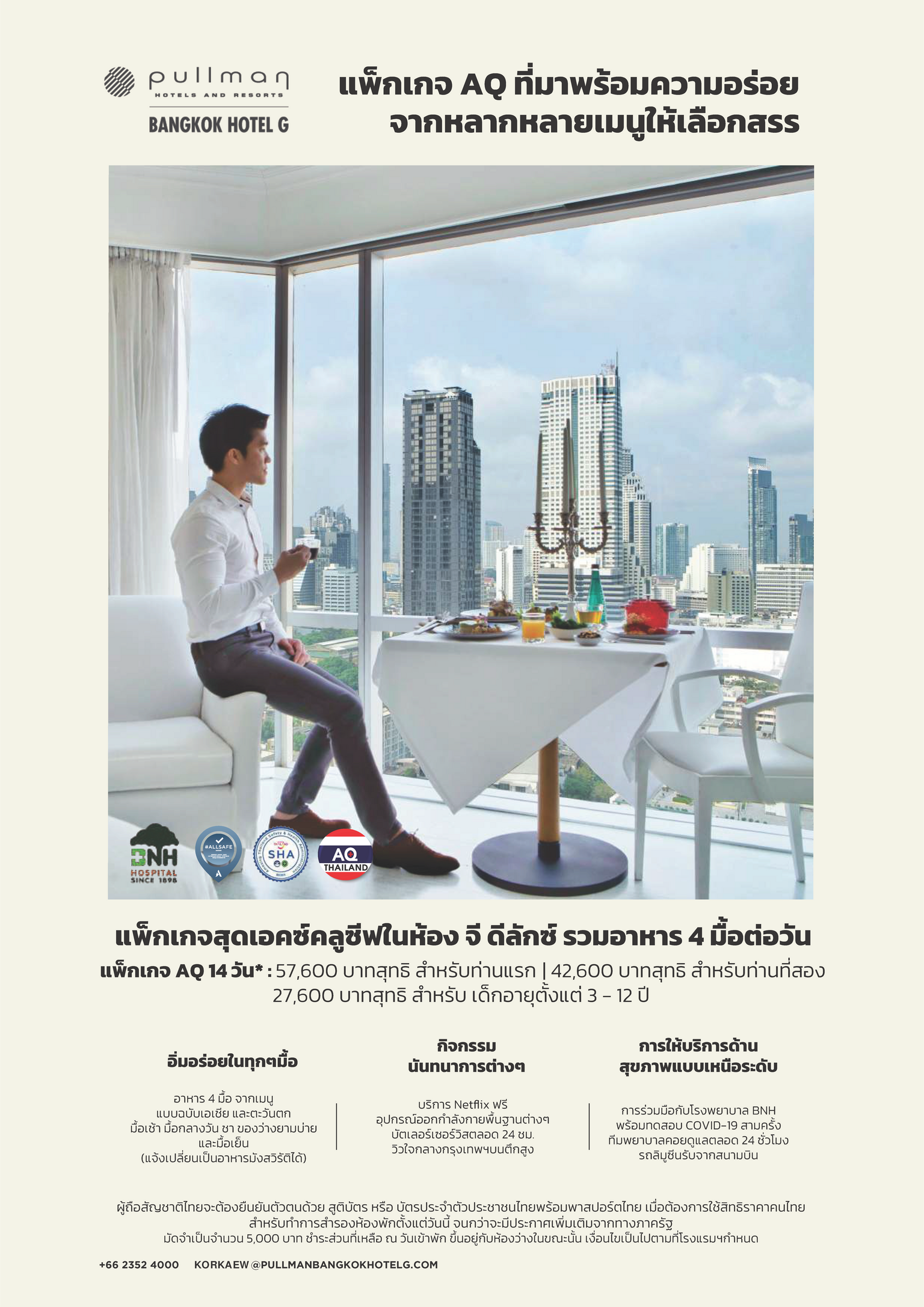Please kindly note that as per the new government regulations, The Thai Nationalnality who confirm ASQ Package at Pullman Bangkok Hotel G from 1st July onwards will be entitled to a THB 6,900 discount per package which is subsidized by the government for the Covid Tests.