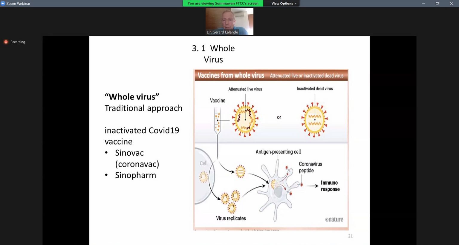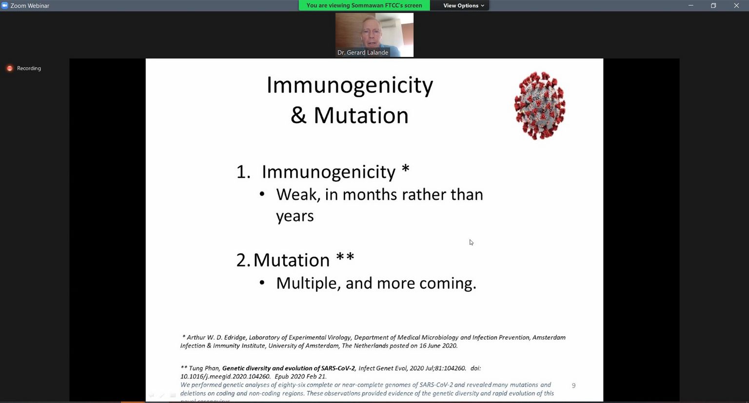 During his 1-hour presentation, he shared with us the current situation of #covid19 in the US, France and Thailand as well as new variants & mutations of virus. He also explained the 3 types of #vaccine (traditional, vectored and Nucleic Acid) and shared his opinions on benefits & risks of each type of vaccine, which is valuable information for our decision.