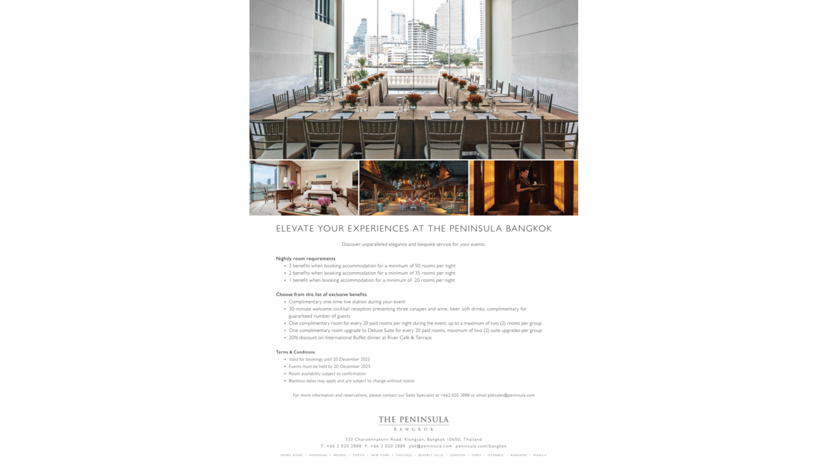 Membres The Peninsula Bangkok: Corporate Group promotion 2025 Le 08/05/2025 Documentation Télécharger The_Peninsula_Bangkok_Corp_MICE_Promotions_2025__1_.pdf (PDF • 483 Ko)