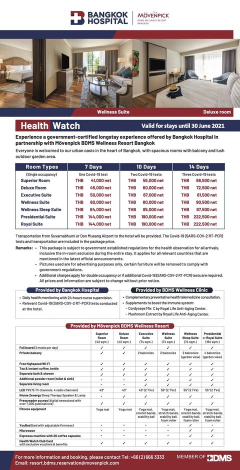 Choose the government-certified Alternative State Quarantine (ASQ) stay at Mövenpick BDMS Wellness Resort Bangkok that suits your needs with 7, 10 & 14 days options available. Select from 7 spacious room-types with private balcony & lush outdoor garden area.