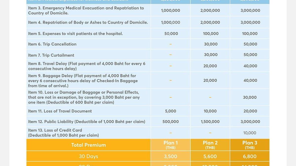 - Cover up to 3.5 million THB (equivalent to at least 100,000USD)