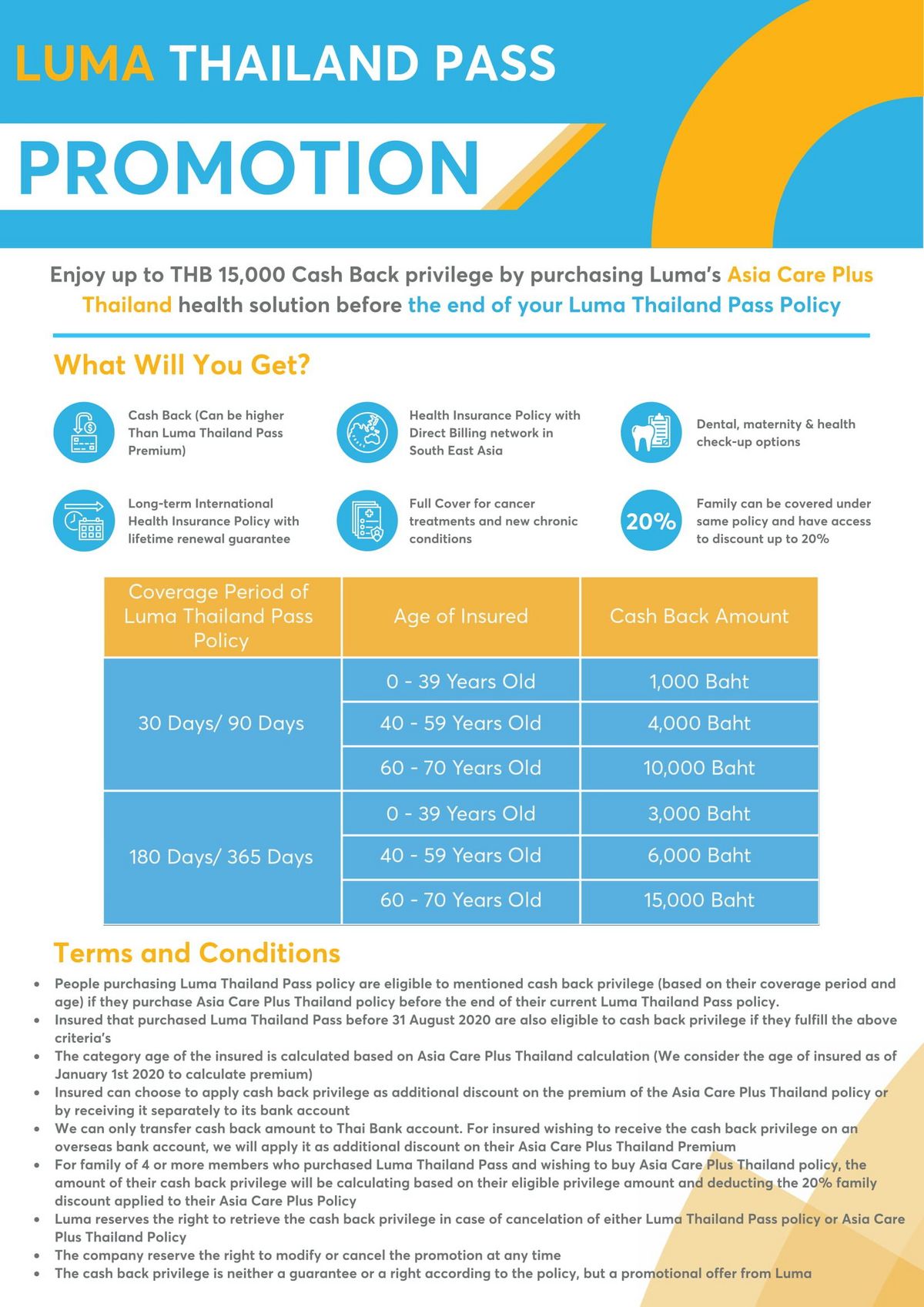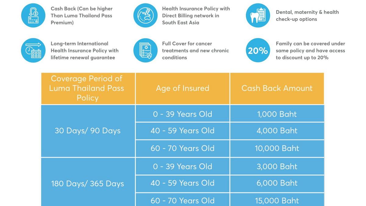 By applying for our LUMA Thailand Pass, you will enjoy up to 15,000THB Cash back privilege by purchasing Luma’s Asia Care Plus Thailand health solution before the end of your Luma Thailand Pass.
