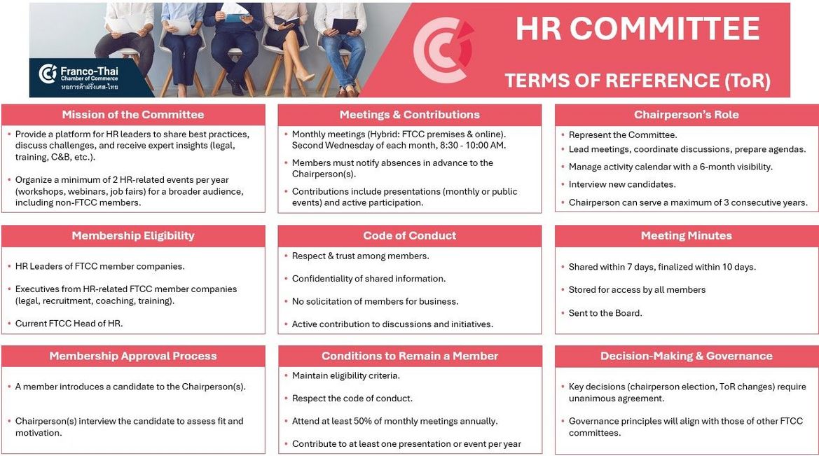 Le comité RH accueille les professionnels des ressources humaines et les personnes engagées dans des questions liées aux ressources humaines dans toutes les industries et tous les secteurs, offrant ainsi une plateforme de collaboration et de partage des connaissances au sein de la communauté d'affaires franco-thaïlandaise.