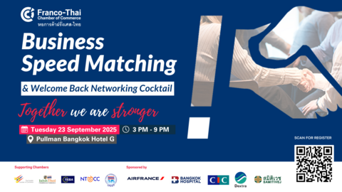 The Franco-Thai Chamber of Commerce proudly invite you to join the signature business networking event allowing you an ideal platform to broaden your network, share expertise, and develop business opportunities. The welcome back event is organized in 2 sessions: Business Speed Matching and Welcome Back Networking Cocktail.