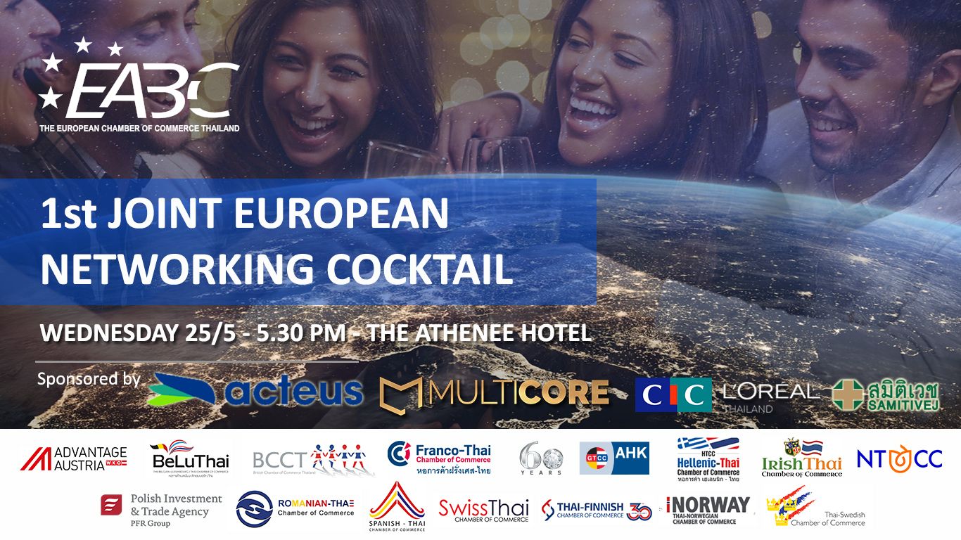 EABC, the European Chamber of Commerce Thailand, is organizing the Joint European Networking Cocktail, in close collaboration with the following 15 European national Chambers of Commerce in Thailand: