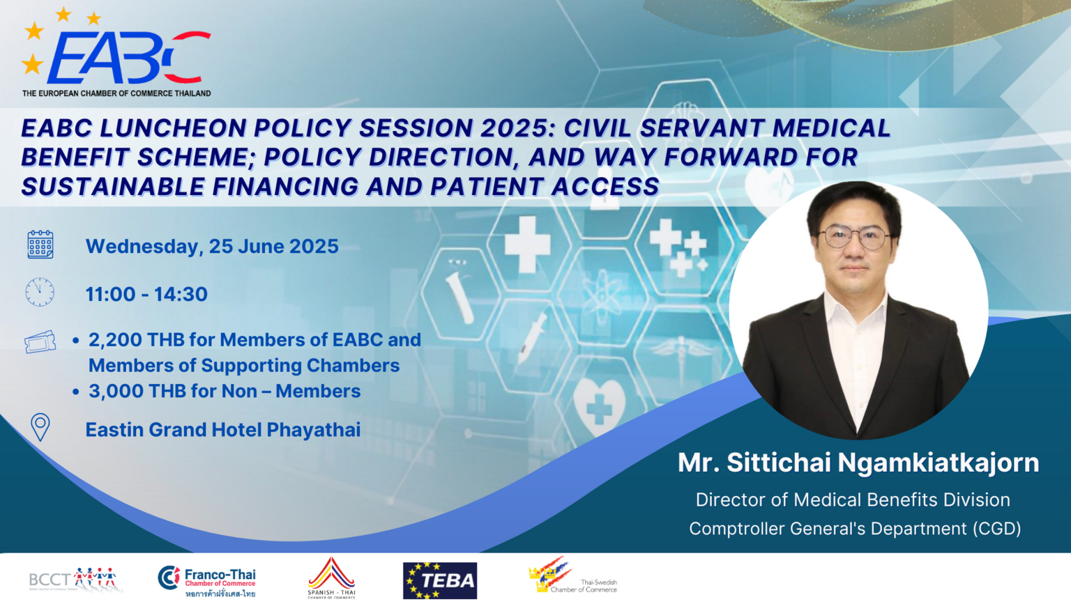 We are delighted to invite you to EABC Luncheon Policy Session 2025: Civil Servant Medical Benefit Scheme; Policy Direction, and Way Forward for Sustainable Financing and Patient Access on Wednesday, 25 June 2025, 11:00 – 14:00 at Eastin Grand Hotel Phayathai