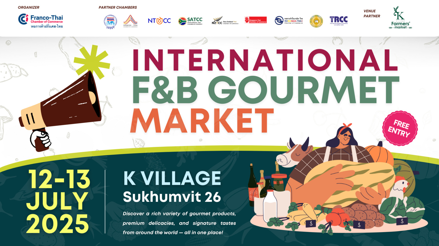 The Joint Foreign Chambers of Commerce, together with the Franco-Thai Chamber of Commerce, Spanish-Thai Chamber of Commerce, South African-Thai Chamber of Commerce, Thai-Italian Chamber of Commerce, Romanian-Thai Chamber of Commerce, Netherlands-Thai Chamber of Commerce, Singapore-Thai Chamber of Commerce, New Zealand-Thai Chamber of Commerce, Thai-Sri Lanka Chamber of Commerce, and Thai-Russian Chamber of Commerce, are delighted to invite you to the International F&B Gourmet Market, taking place on 12–13 July 2025 at K Village, Sukhumvit 26.