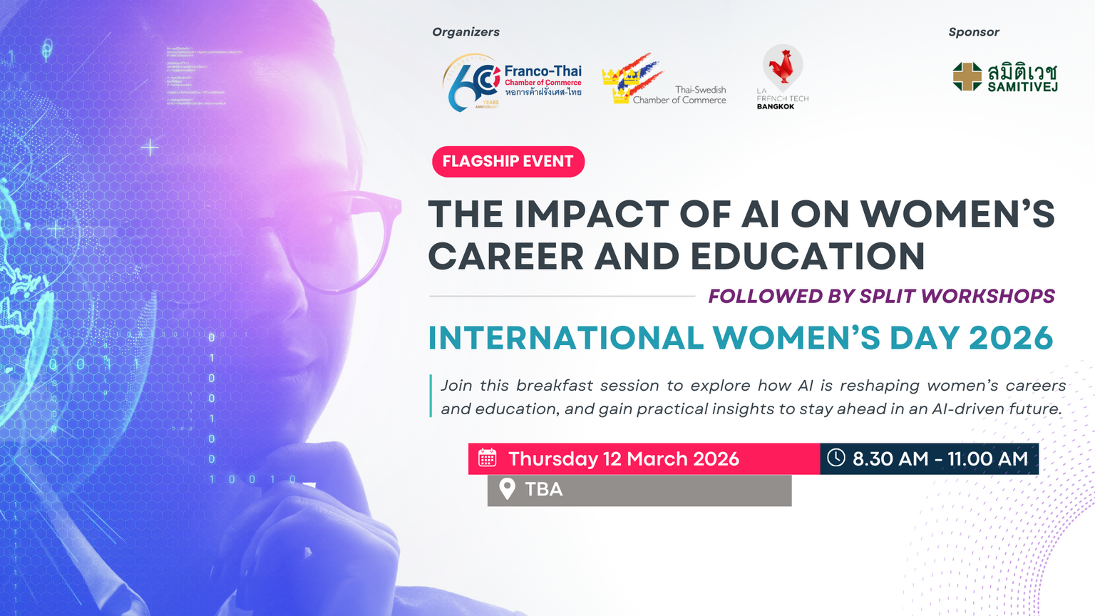 The Franco-Thai Chamber of Commerce (FTCC), in collaboration with Swedish-Thai Chamber of Commerce (SweCham) and La French Tech Bangkok, is pleased to invite you to our Annual International Women’s Day Breakfast 2026.